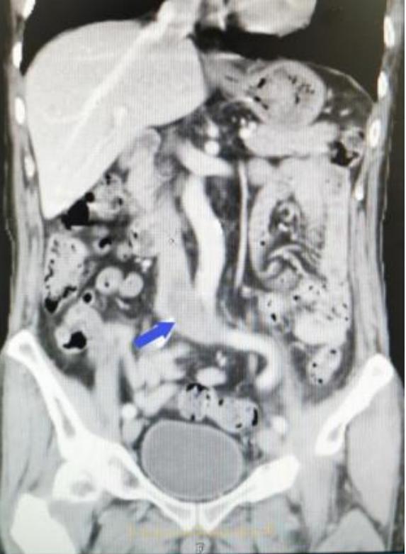 (▲术前彭先生CT影像资料,蓝色箭头所指为下腔静脉内血栓)