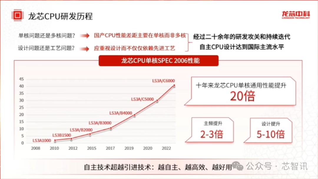 张戈表示,龙芯 CPU 的主要 IP 核均为自主研发,通过自主研发 IP 核大幅提高性价比。国产 CPU 性能与主流 CPU 差距主要在单核而非多核,近十年龙芯 CPU 单核通用性能提升了 20 倍,主频提升 2-3 倍,设计能力提升了 5-10 倍。