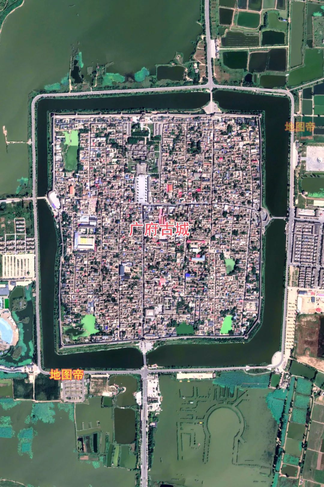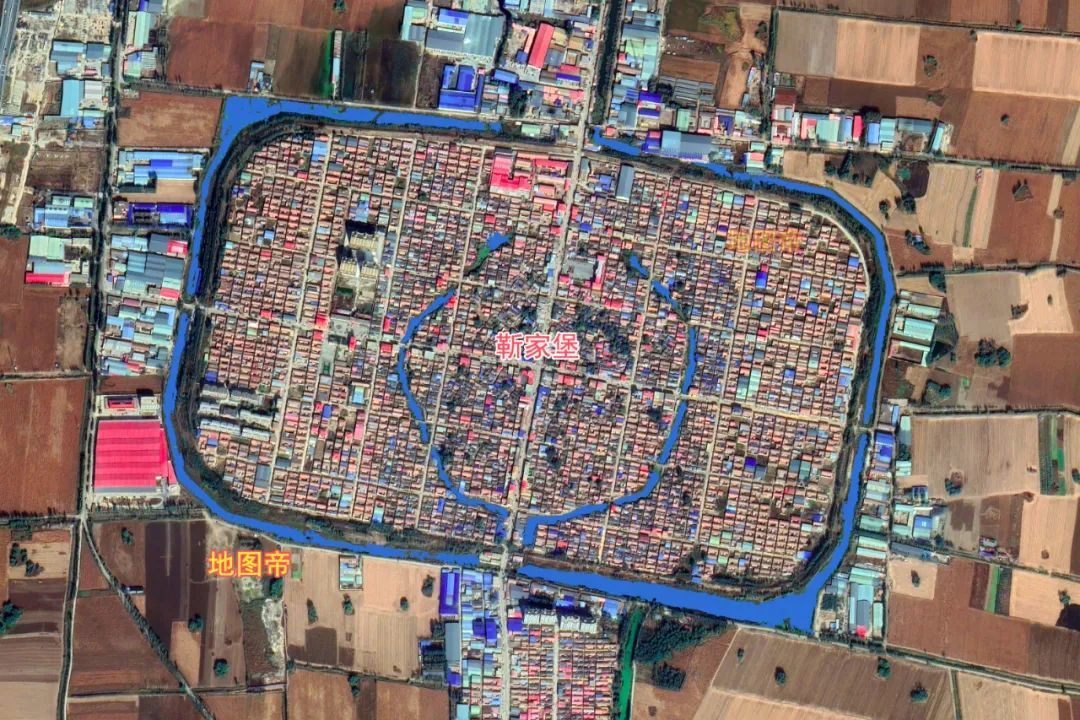 廊坊靳家堡村内圆外方,中间是一圈圆形的水域,外围护城河呈矩形,四个角是弧形。