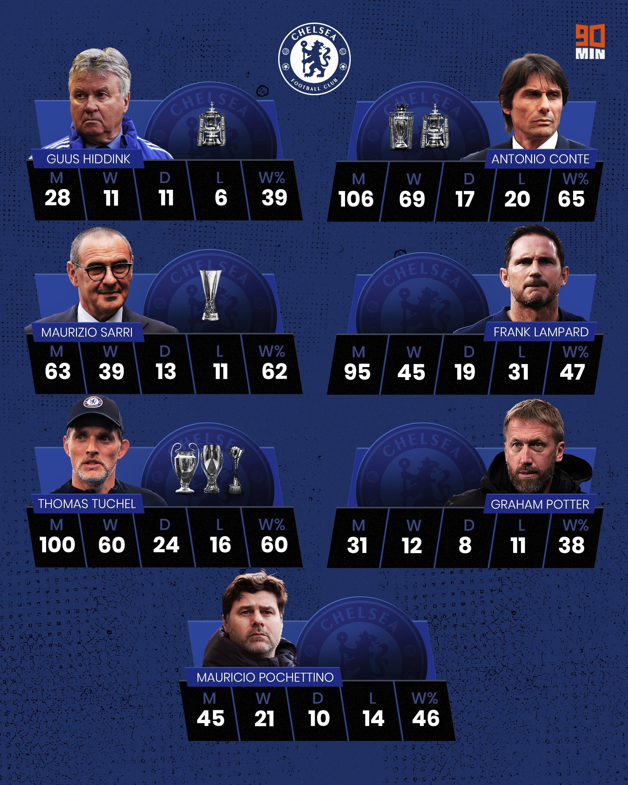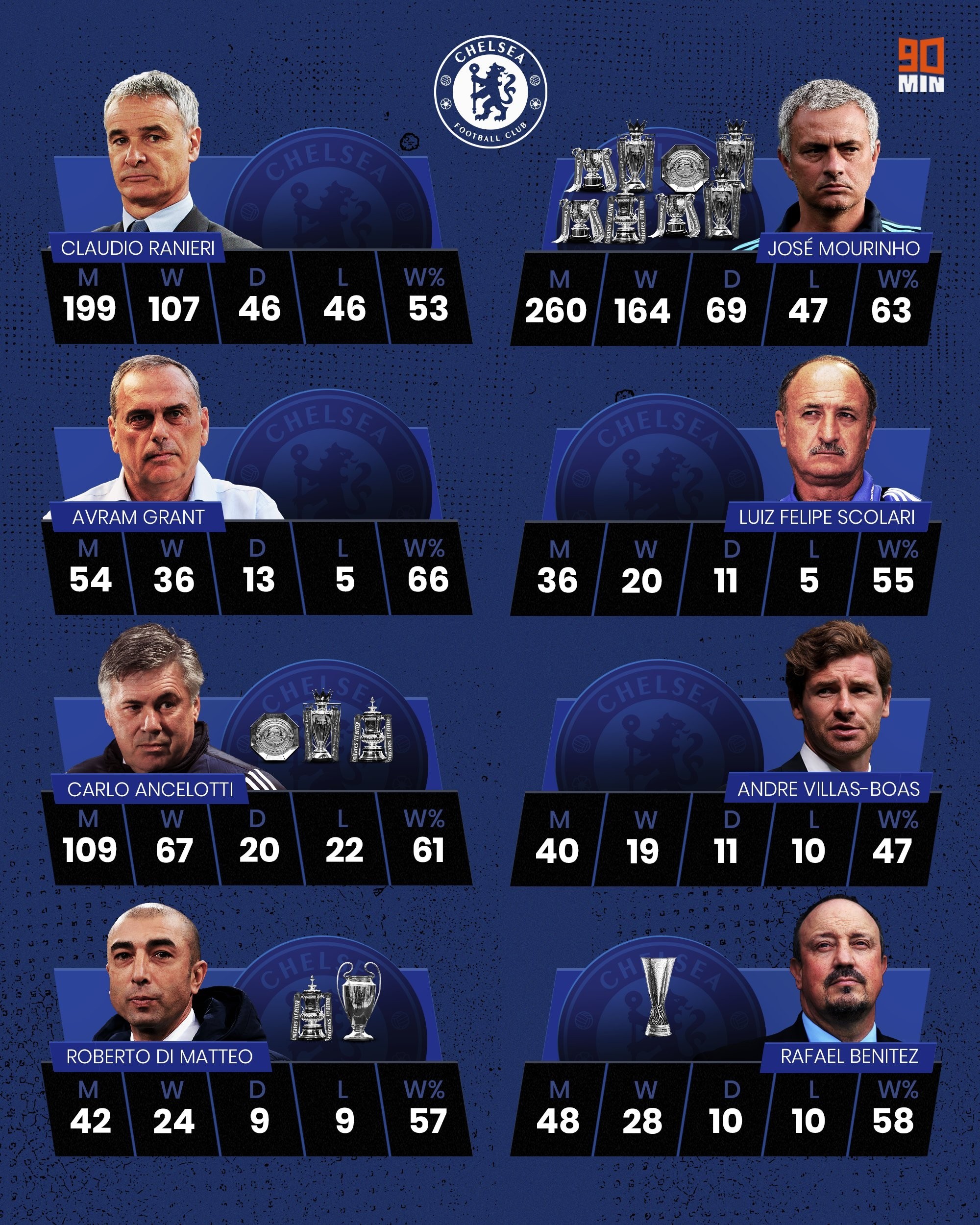 英国媒体90min盘点了21世纪后上任的切尔西历任主帅以及他们所取得的成绩。