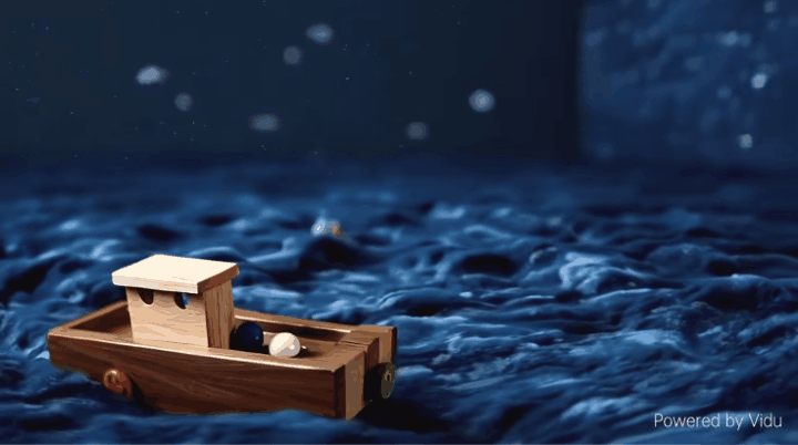 提示:一艘木头玩具船在地毯上航行给视频注入「镜头语言」