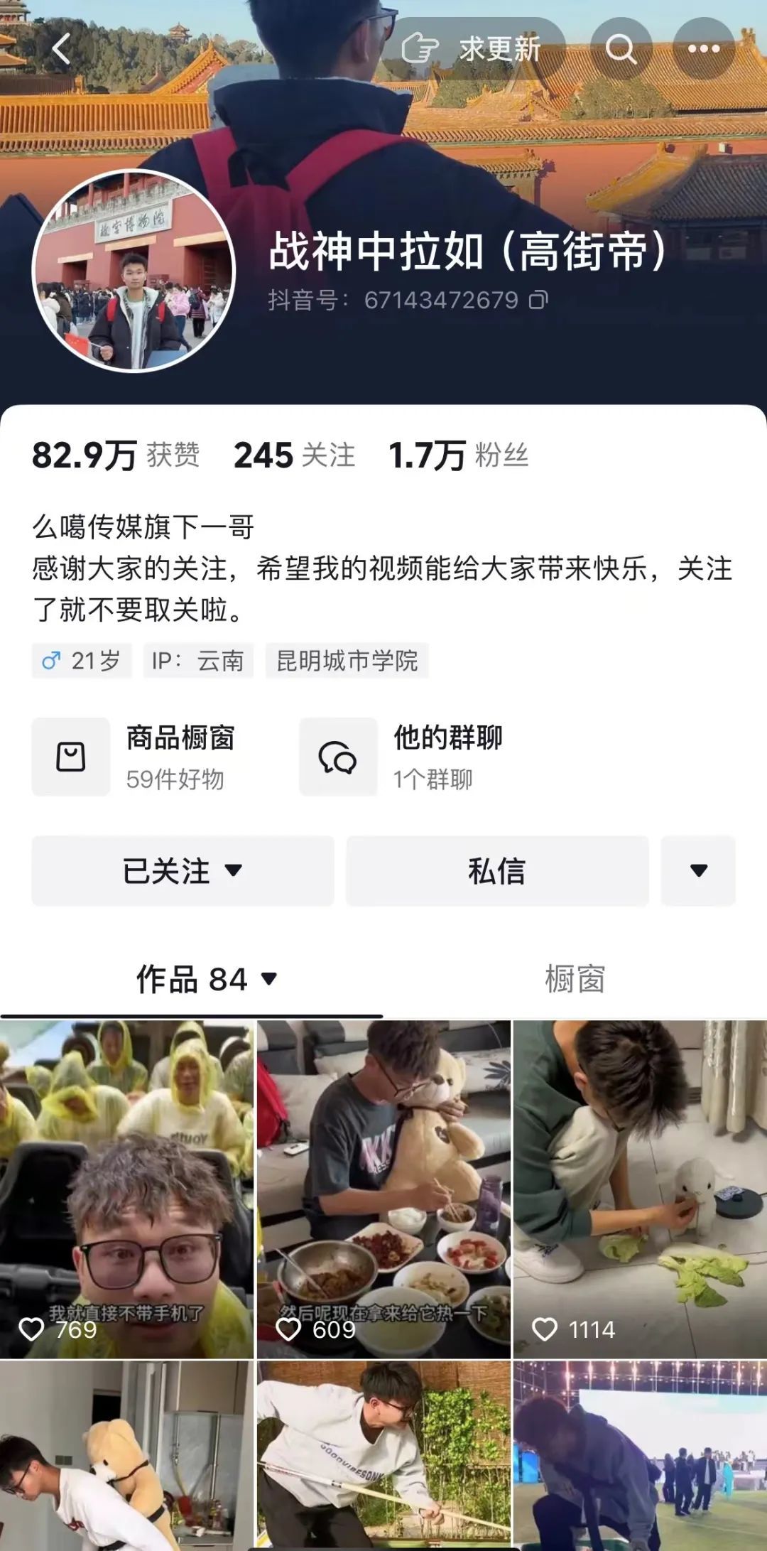 更有“男大”直接以“么噶传媒”一哥的身份去小英家里“进修”模仿精髓。同样在云南的@战神中拉如(高街帝) 在发布模仿小英相关视频后,被网友评为是“全网既像上拉如又像小英的人”。为此,他还亲自去小英家里看望,让这段“缘分”加深。从他发布的视频来看,基本模仿小英相关的内容,少则有几千赞多则有上万赞。