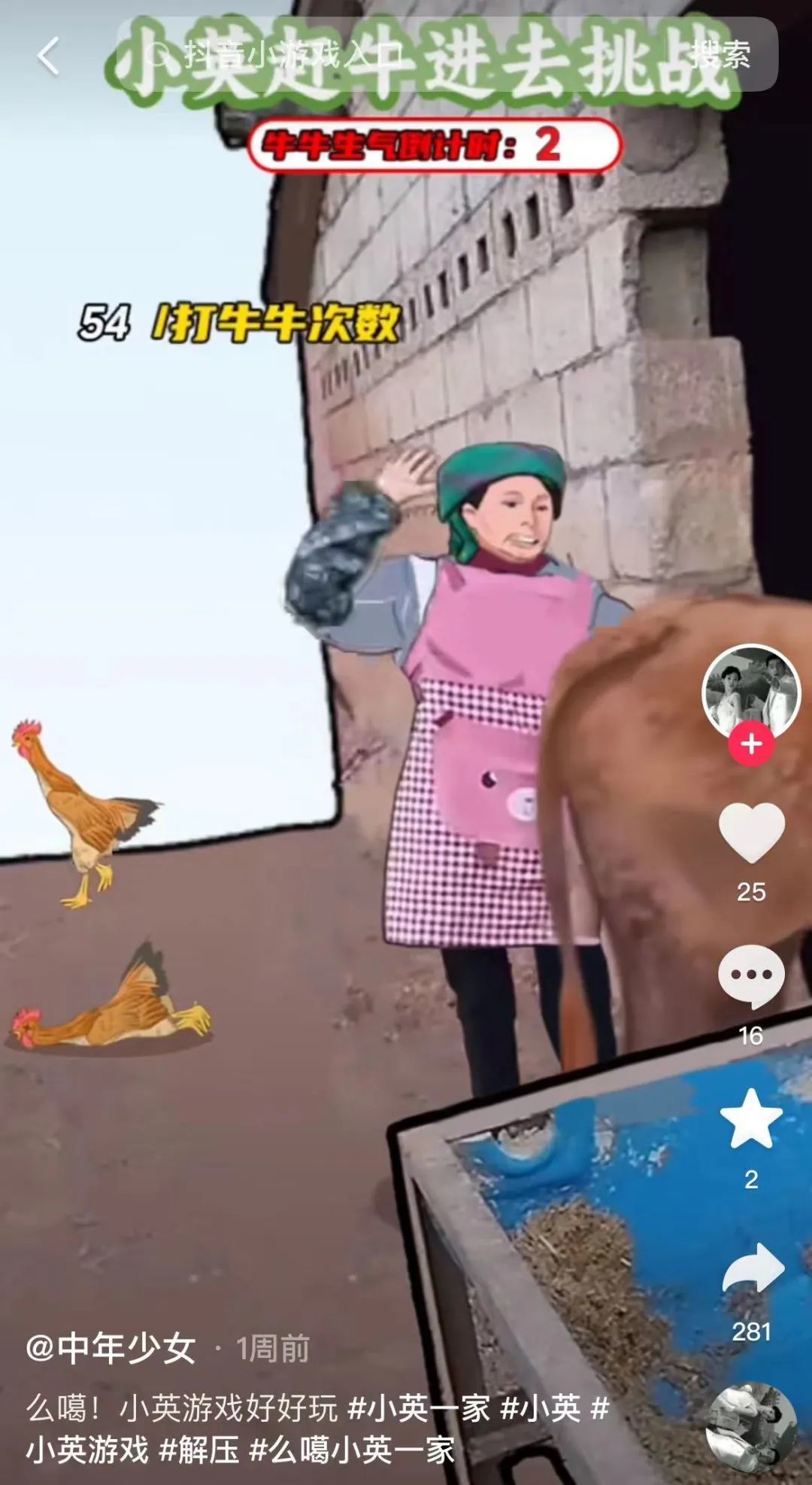 1996年的小英是云南寻甸回族彝族自治县县城里的一位普通村民,这里和大多数农村县城一样,都是男人出去工作,女人在家做家务带孩子。或许是想给自己“无聊”的生活找点“乐子”,小英也开始学习别人,拿起手机记录自己的农村生活日常。既有日常记录喂牛、搬包谷,也有自己的美照或者咨询网友生活问题的碎碎念等等。截止目前,@小英一家 抖音账号粉丝已有 232万。