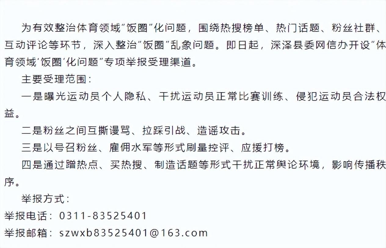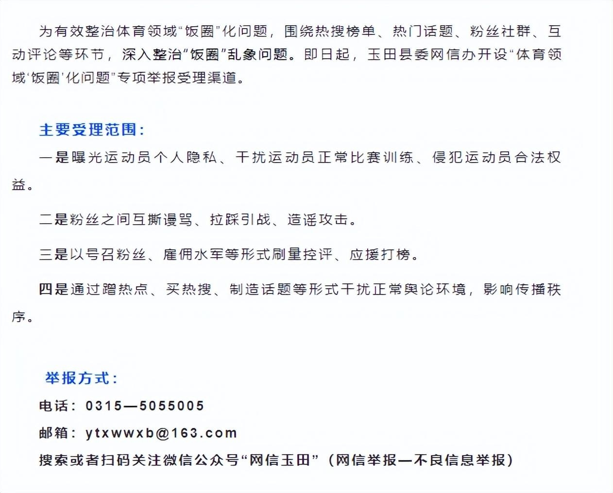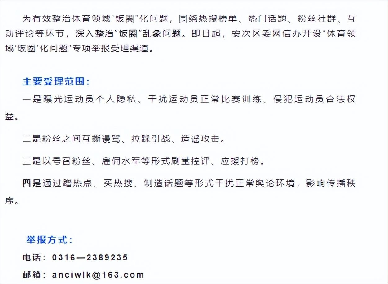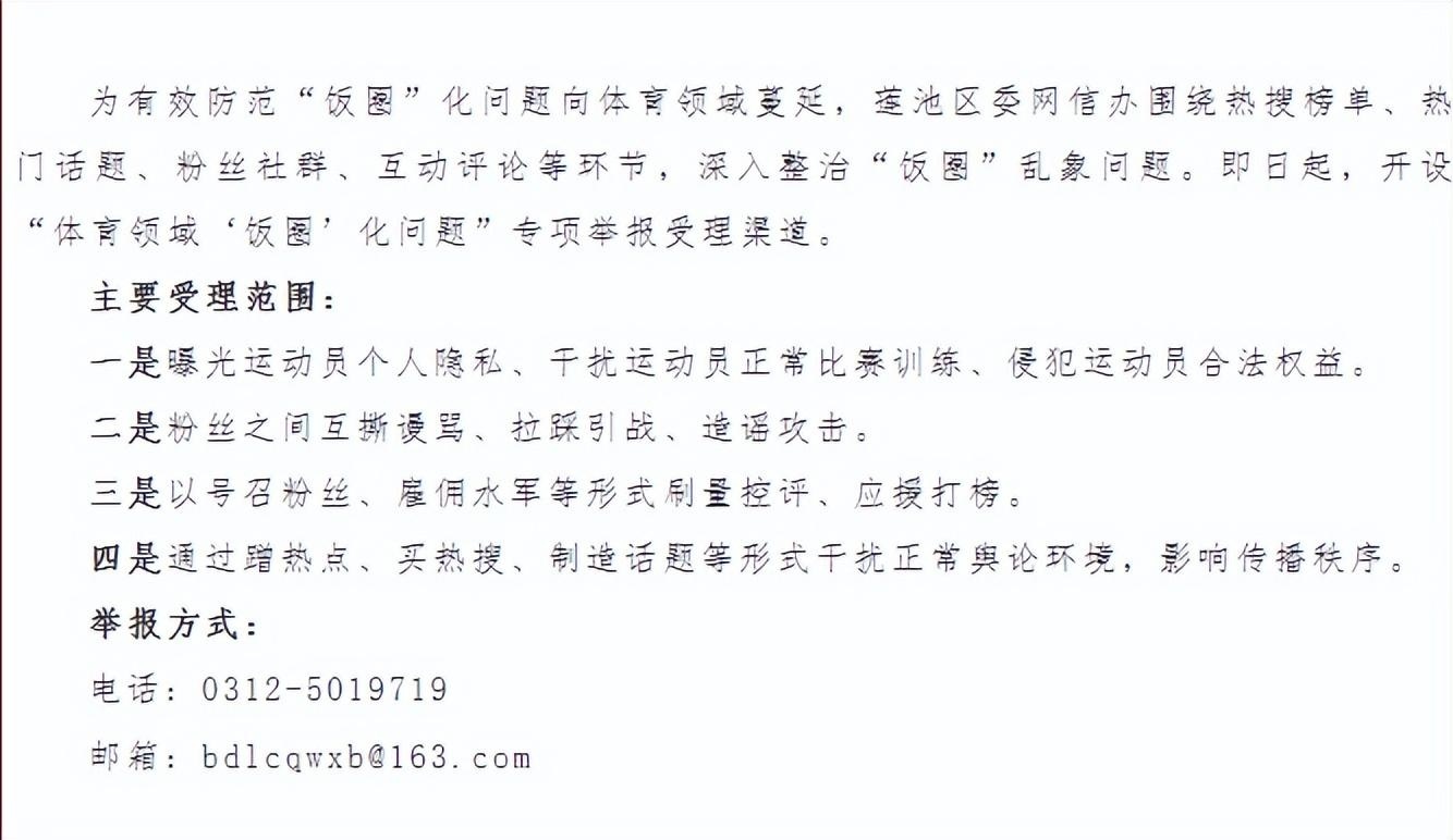 4月中旬,河北多地网信办同样针对体育领域“饭圈”化问题,开设专项举报受理渠道。