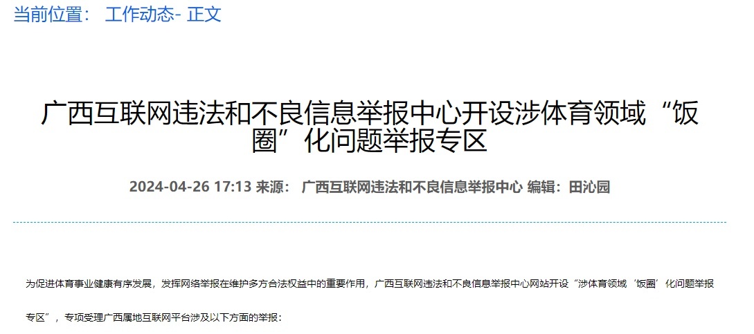 4月26日,广西网信办开设涉体育领域“饭圈”化问题举报专区,专项受理广西属地互联网平台涉体育领域“饭圈”化包括:曝光运动员个人隐私、干扰运动员正常比赛训练、侵犯运动员合法权益;粉丝之间互撕谩骂、拉踩引战、造谣攻击;以号召粉丝、雇佣水军等形式刷量控评、应援打榜;通过蹭热点、买热搜、制造话题等形式干扰正常舆论环境,影响传播秩序等方面的问题举报。