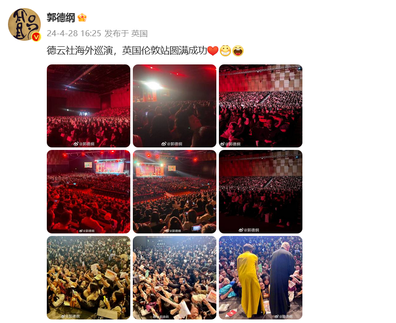 郭德纲晒出伦敦巡演现场照写道:“德云社海外巡演,英国伦敦站圆满成功。”