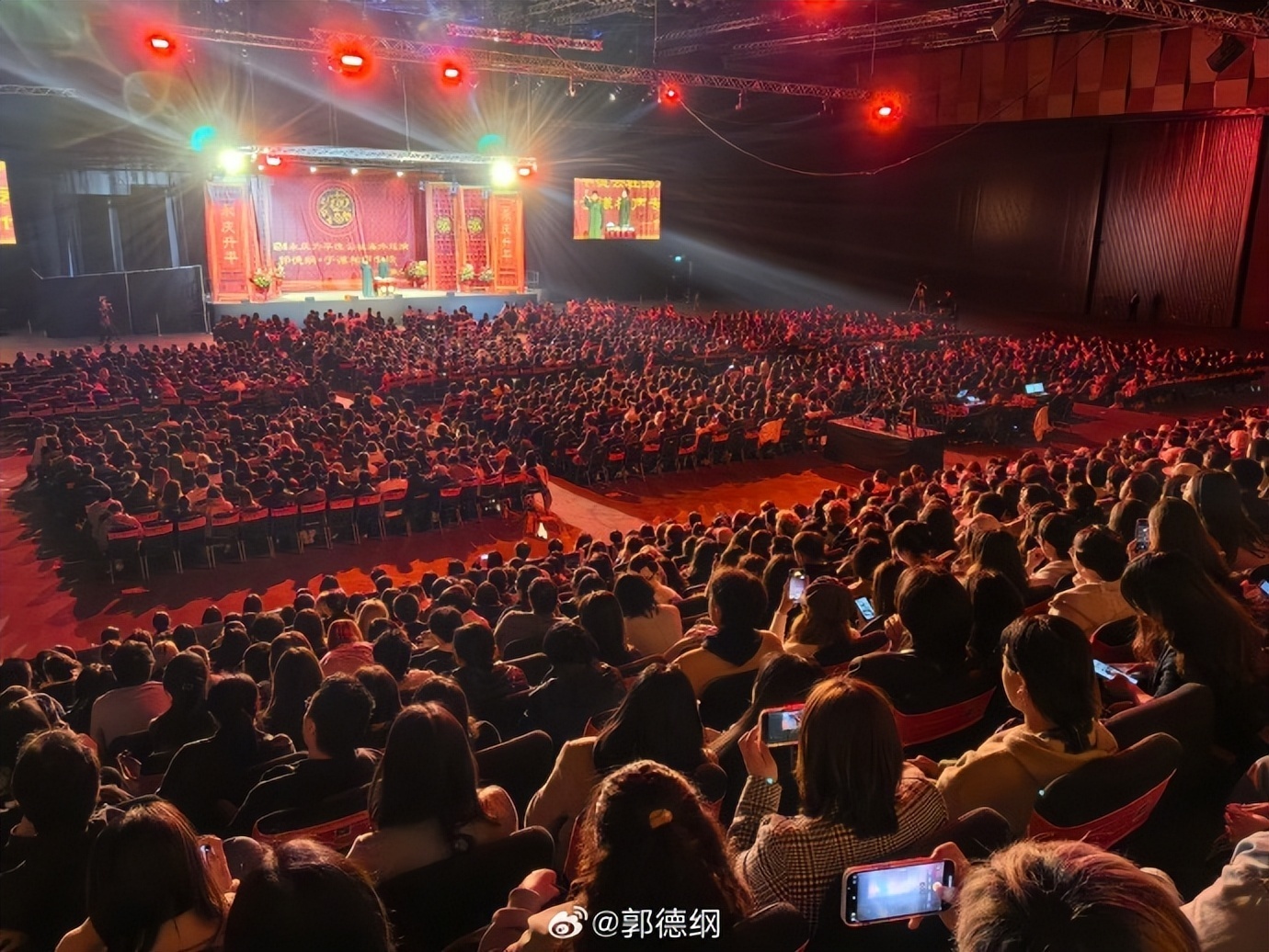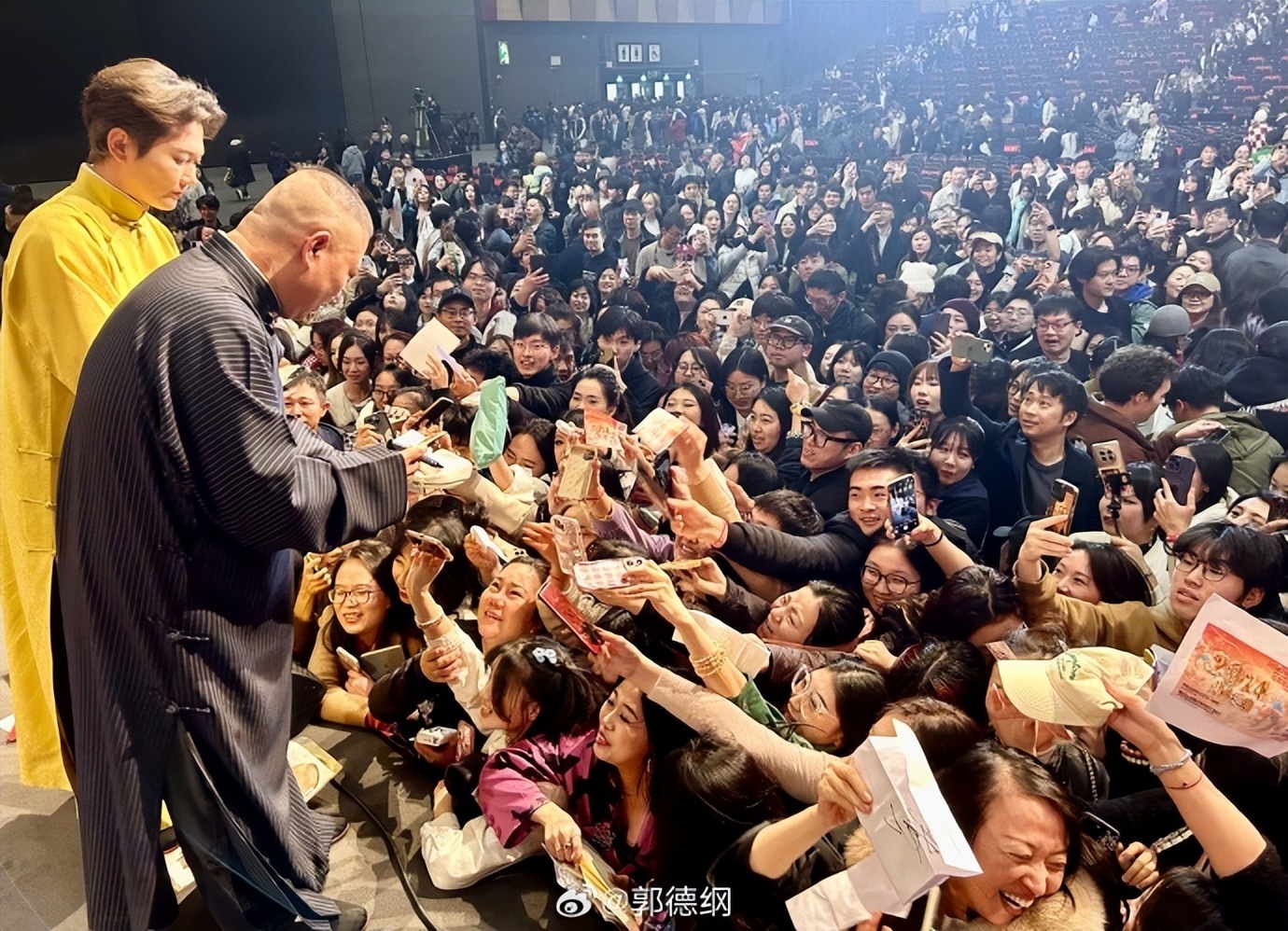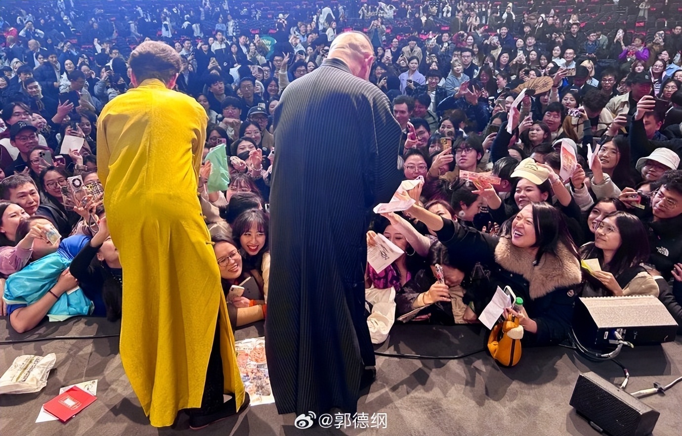 照片中,郭德纲一身黑衣,携徒弟孟鹤堂在台上表演,场下座无虚席,众多前排观众举着纸要求签名,人气火爆。