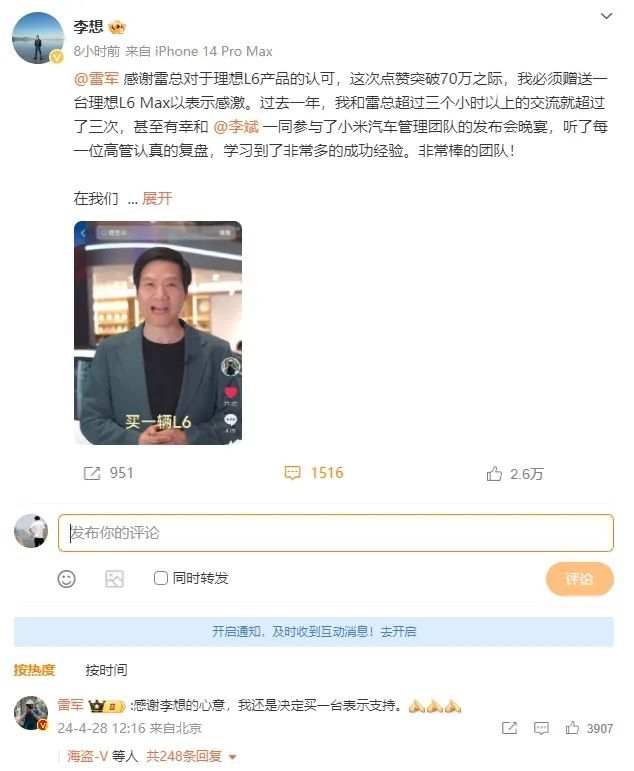 中国人讲究礼尚往来,为了表示这波流量的感谢,李想特意赠送雷军一辆L6MAX,但雷军也是懂流量的,坦白的回应不需要,自己购买就好,然后就开直播了...