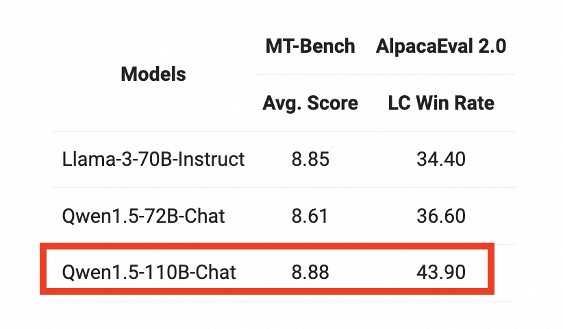 研发团队还在MT-Bench和AlpacaEval 2.0两个测评集上对1100亿参数模型的Chat版本作了评估,通义千问110B比通义千问72B的效果有显著提升。