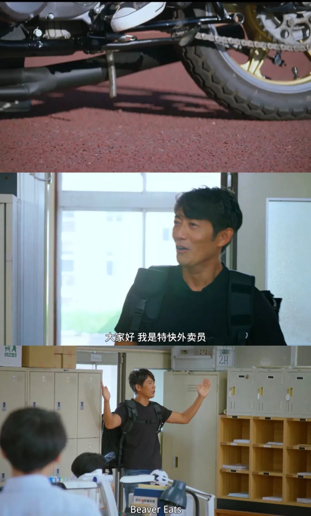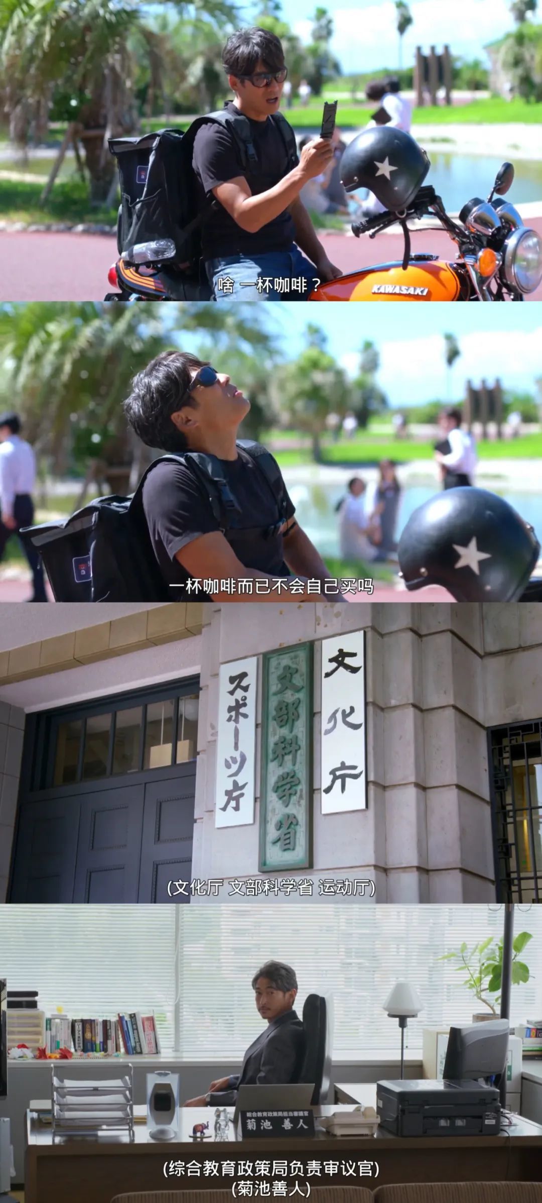 一开场,这位前暴走族竟然真的骑着川崎摩托当跑腿,送上外卖了。