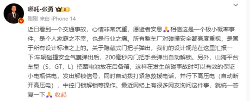 今日中午,哪吒汽车CEO张勇发布微博讲解了自家车辆的隐藏式门把手相关内容。