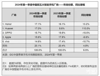 生态闭环除了带来使用体验的提升外,也大幅增加了用户的粘性,消费者对于品牌的忠诚度也随之而来。回看,国际数据公司(IDC)发布的2024年第一季度中国手机市场跟踪报告,荣耀和华为俩家公司分别以17.1%和17%的市场份额并列第一,在产品力存在客观不足的情况下,搭建完善的系统生态和目标用户对品牌的高忠诚度是这两家公司手机销量的保障。
