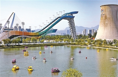 五一假日,石景山首钢园成为“微度假”热门打卡地。游客们在园区内除了游园划船、品尝美食,还可以体验攀岩等极限运动。 文并摄/本报记者 崔峻