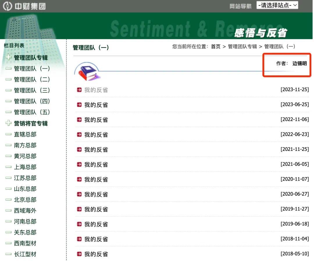 边锡明本人较少在公开场合露面,其动态主要体现在中财集团内部的文件中。中财集团官网显示,署名边锡明的文章“我的反省”及“我的总结”最早更新于1996年1月8日,并持续到2023年11月25日,仅有少数年份有断更。
