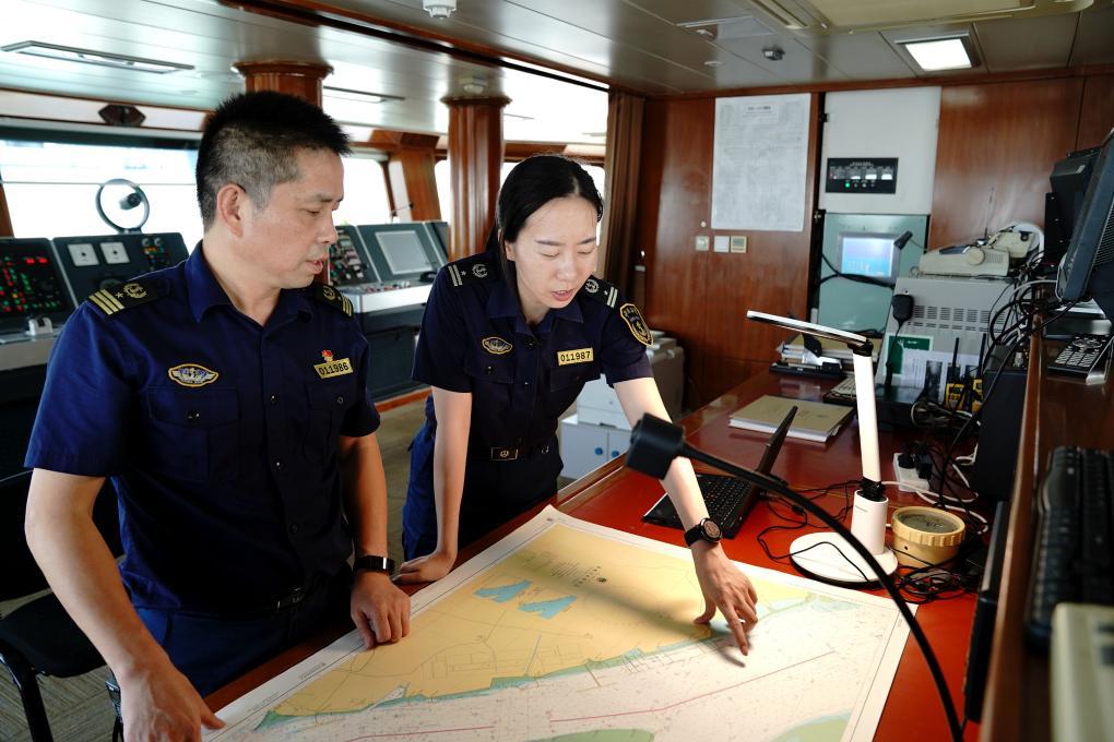 詹春珮(右)在“海巡01”轮工作中(2022年6月21日摄)。新华社记者 张建松 摄