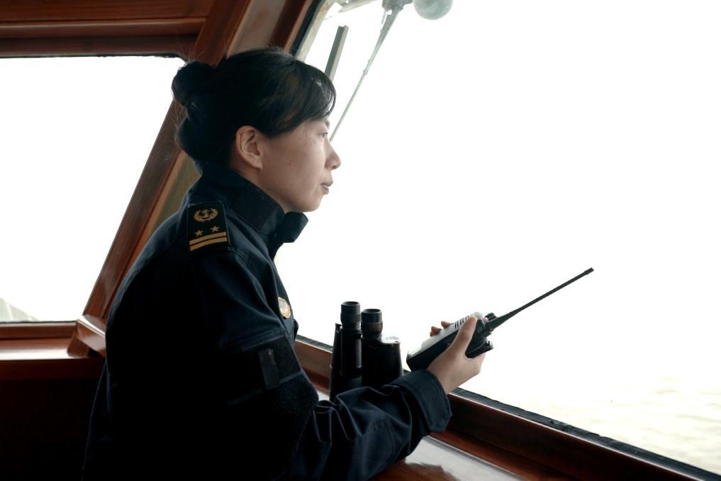 在宽敞明亮的驾驶台,英姿飒爽的詹春珮手持对讲机,有条不紊地指挥全船上下协调配合,顺利驾驶“海巡01”轮缓缓驶离码头,直奔长江口目标海域执行专项巡航执法任务。