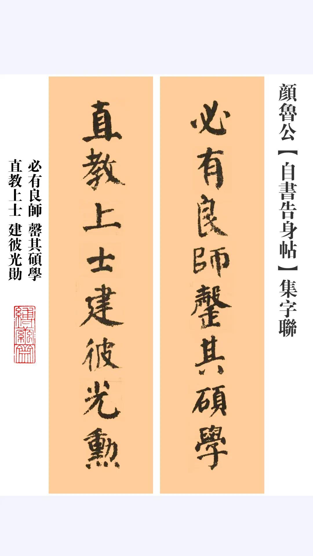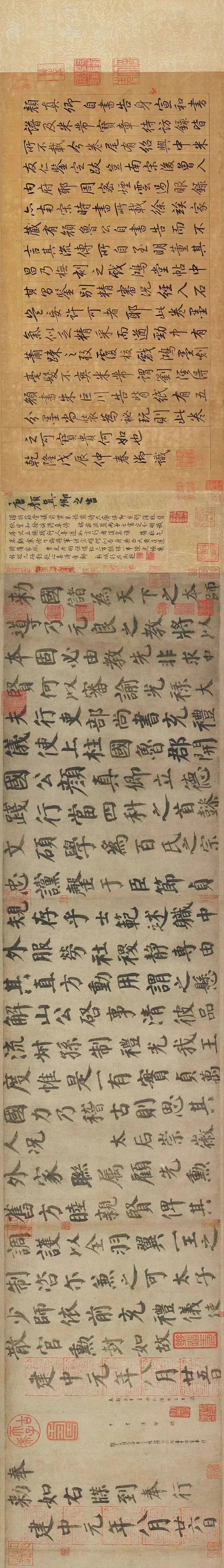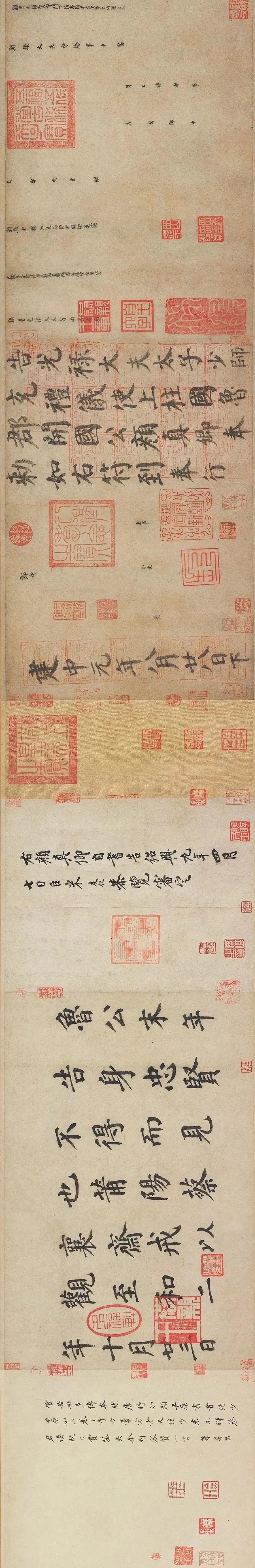 【释文】敕:国储为天下之本,师导乃元良之教。将以本固,必由教先,非求忠贤,何以审谕?光禄大夫行吏部尚书充礼仪使上柱国鲁郡开国公颜真卿,立德践行, 当四科之首; 懿文硕学,为百氏之宗。忠谠罄于臣节,贞规存乎士范。述职中外,服劳社稷。静专由其直方,动用谓之悬解。山公启事,清彼品流;叔孙制礼,光我王度。惟是一有,实贞万国,力乃稽古,则思其人。况太后崇徽,外家联属,况太后崇徽,外家联属,俾其调护,以全羽翼,一王之制,咨尔兼之。可令其任太子少师。依前充礼仪使,散官勋封如故。建中元年八月廿五日。奉勑如,右牒到奉行。建中元年八月廿六日。告光禄大夫太子少师充礼仪使上柱国鲁郡开国公颜真卿,奉勅如右,符到奉行。建中元年八月二十八日下。