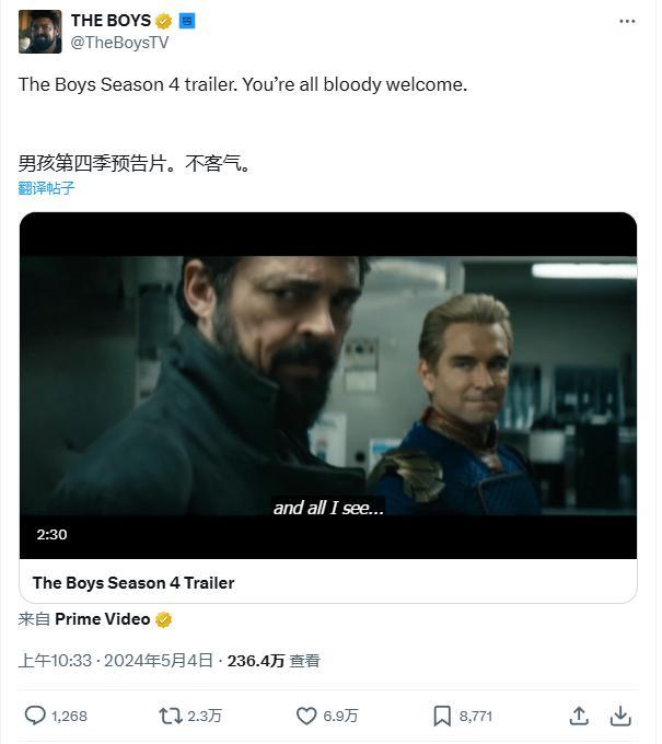 在第三季大结局播出两年后,亚马逊 Prime 热门剧集《黑袍纠察队》第四季官宣将于 6 月 13 日回归,首播共三集,后续每周都会推出新剧集(共 8 集,一直到 7 月 18 日)。