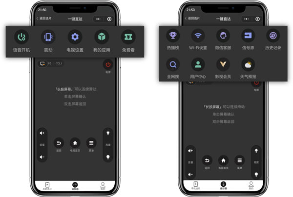 遥控器界面顶部新增“一键直达”快捷键区域。涵盖了电视常用功能。