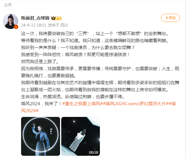 本是戏剧演员的她,在4月19日开播的综艺《乘风2024》中,一袭红衣,惊艳亮相。