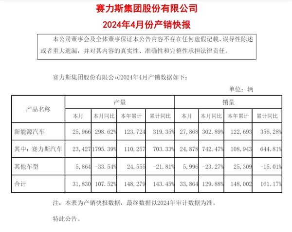 在此之前,赛力斯发布的2024年一季报和2023年年报显示,得益于AITO问界系列市场表现的持续向好,以及降本增效、技术创新等多重举措的实施,公司今年一季度实现了营收净利双增长。