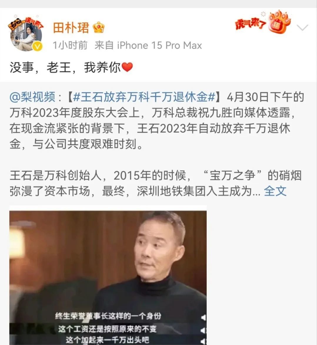 谁知道消息发酵后,妻子田朴珺喊话王石: