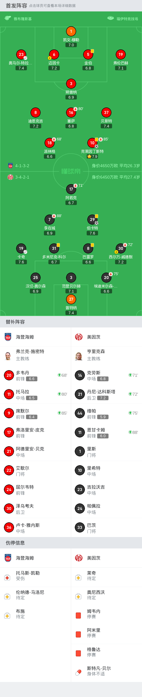 美因茨首发:30-西尔万-威德默, 31-多米尼克-科尔, 27-曾特纳, 17-阿若克, 20-埃迪米尔森-费尔南德斯, 25-汉切-奥尔森, 7-李在城, 19-卡奇, 8-巴雷罗, 3-范登贝尔赫, 29-伯卡特
