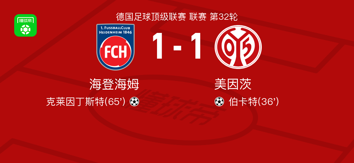 在北京时间5月6日,德国足球顶级联赛迎来了第32轮的比赛,海登海姆队与美因茨队展开了激烈的对决。克莱因丁斯特在比赛中攻入一球,为海登海姆队取得领先。随后,伯卡特为美因茨队打入一球,将比分扳平。最终,双方握手言和,比分定格在1-1。