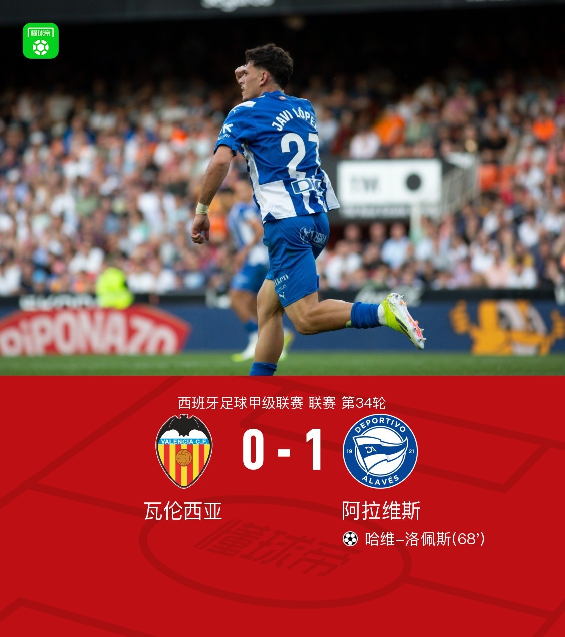 北京时间5月6日,西班牙足球甲级联赛迎来第34轮的激烈对决,瓦伦西亚坐镇主场迎战阿拉维斯。上半场双方互交白卷,迭戈-洛佩斯后插上推射高出错失良机,卡洛斯-比森特传中,基克-加西亚头球攻门击中立柱。下半场,卡洛斯-比森特助攻哈维-洛佩斯破门打破僵局。彼得-冈萨雷斯越位在先,迭戈-洛佩斯的进球被吹无效。最终阿拉维斯客场1-0险胜瓦伦西亚。