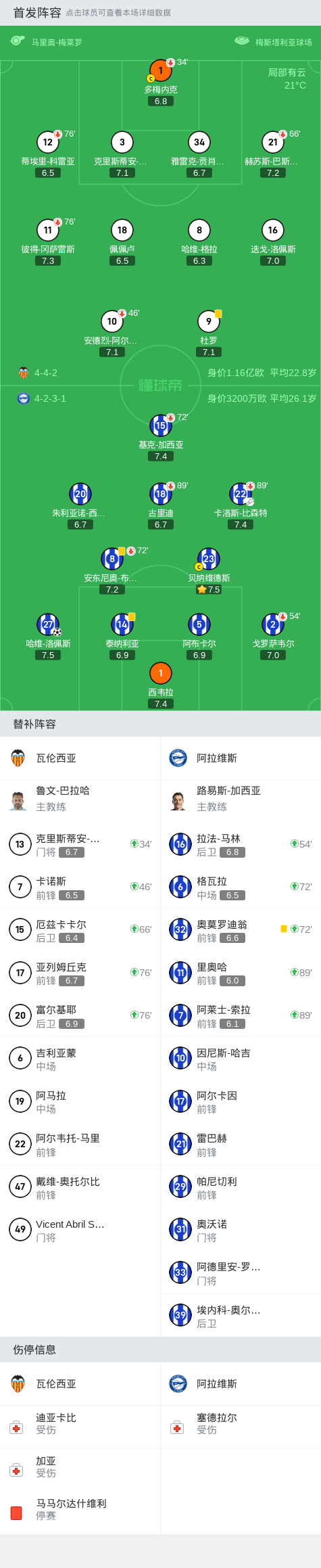 瓦伦西亚首发:1-多梅内克, 18-佩佩卢, 10-安德烈-阿尔梅达, 9-杜罗, 12-蒂埃里-科雷亚, 21-赫苏斯-巴斯克斯, 16-迭戈-洛佩斯, 11-彼得-冈萨雷斯, 3-克里斯蒂安-莫斯克拉, 34-雅雷克-贡肖罗夫斯基, 8-哈维-格拉