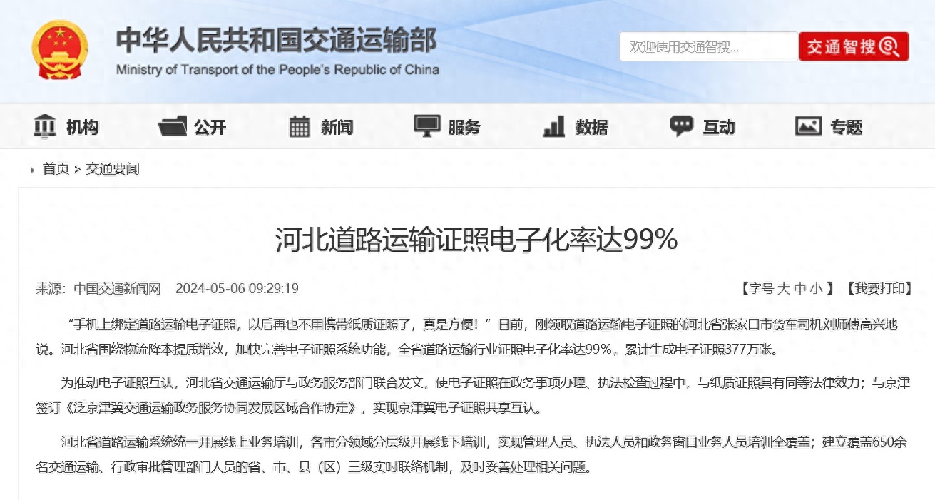 5月6日,据交通运输部消息,“手机上绑定道路运输电子证照,以后再也不用携带纸质证照了,真是方便!”日前,刚领取道路运输电子证照的河北省张家口市货车司机刘师傅高兴地说。河北省围绕物流降本提质增效,加快完善电子证照系统功能,全省道路运输行业证照电子化率达99%,累计生成电子证照377万张。