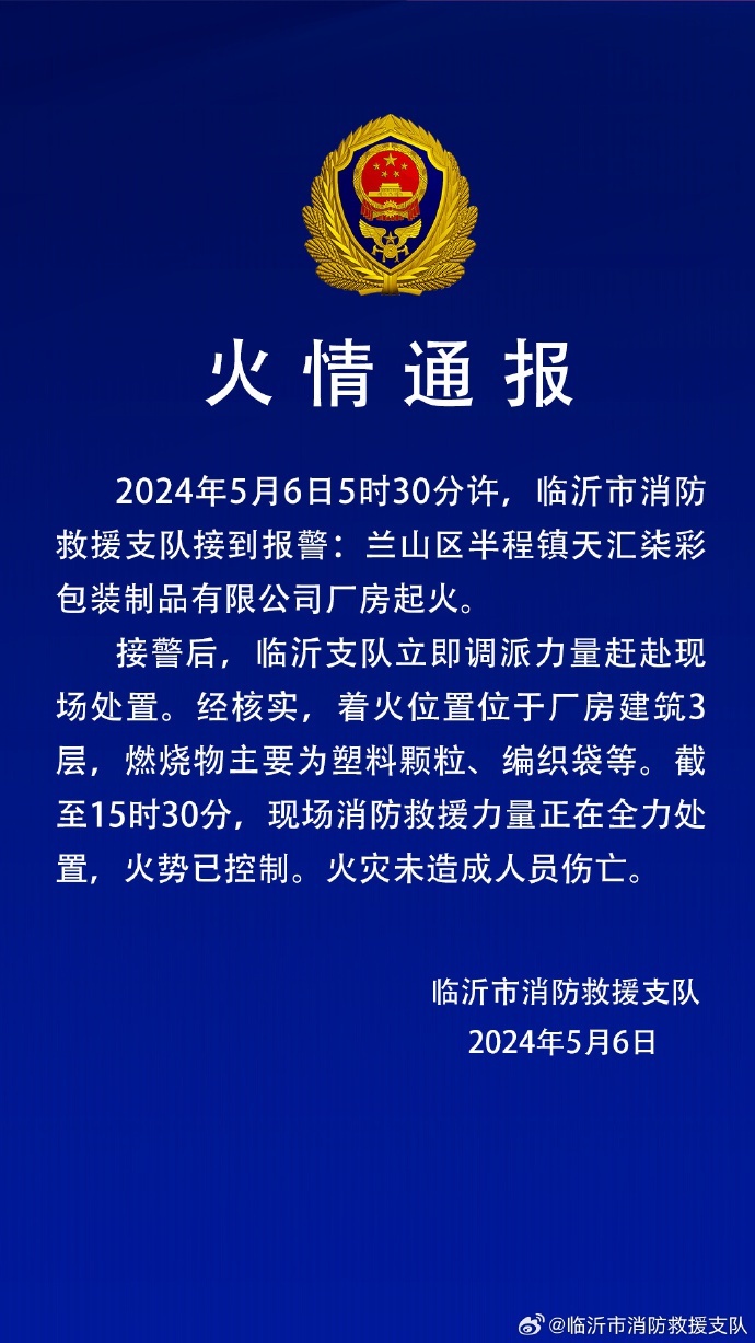 接警后,临沂支队立即调派力量赶赴现场处置。经核实,着火位置位于厂房建筑3层,燃烧物主要为塑料颗粒、编织袋等。截至15时30分,现场消防救援力量正在全力处置,火势已控制。火灾未造成人员伤亡。