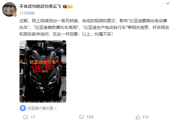 其表示:近期,网上陆续流出一系列拼接、合成的视频和图文,散布“比亚迪要推出电动摩托车”、“比亚迪首款摩托车亮相”、“比亚迪生产电动自行车”等相关信息,好多网友和朋友前来询问,在此一并回复:以上,均属不实!