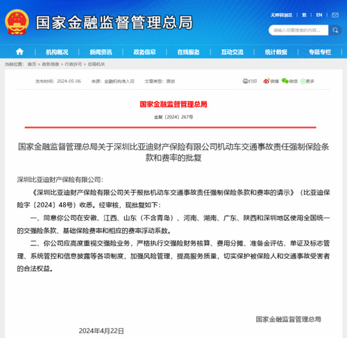 5月6日上午,国家金融监管总局官网挂出对深圳比亚迪财产保险有限公司(下称比亚迪财险)关于报批机动车交通事故责任强制保险条款和费率的请示作出公开回复。国家金融监管总局称,同意比亚迪财险在安徽、江西等地使用全国统一的交强险条款、基础保险费率和相应的费率浮动系数。