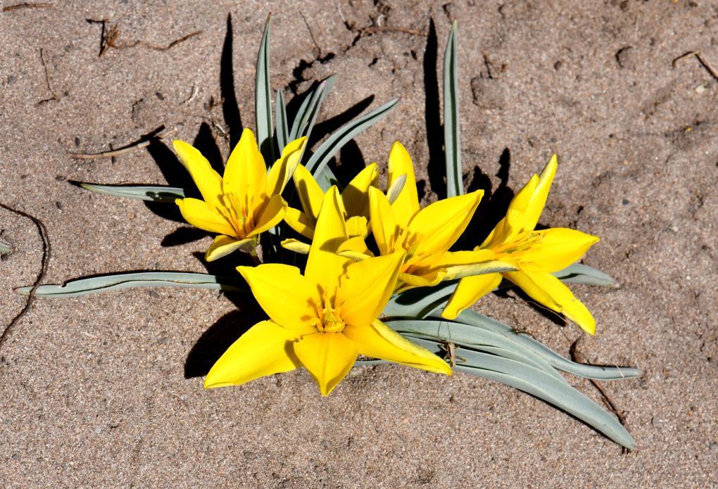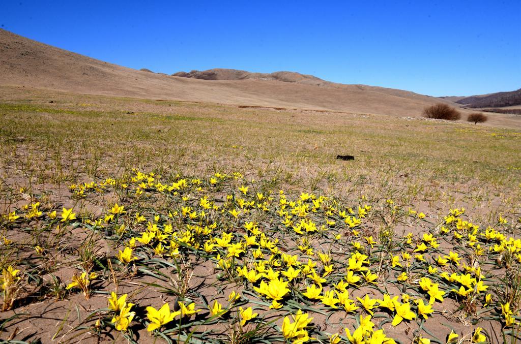 据周繇介绍,蒙古郁金香是多年生草本植物,植株高10至25厘米,花为鲜黄色,花期5月份,果期6月份,生于草原带覆沙地中,仅分布于我国内蒙古,是当地特有种,也是郁金香属植物在全球分布最东的一个物种。