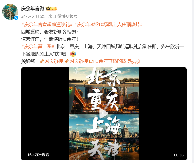 随后,《庆余年》官博宣布开启超前巡映礼,并发布4城10场风土人“庆”预热片。“四城巡映,老友新朋齐相聚;惊喜连连,佳期将近庆余年!《庆余年第二季》北京、重庆、上海、天津四城超前巡映礼启动在即,先来欣赏一下各地的风土人‘庆’吧!”