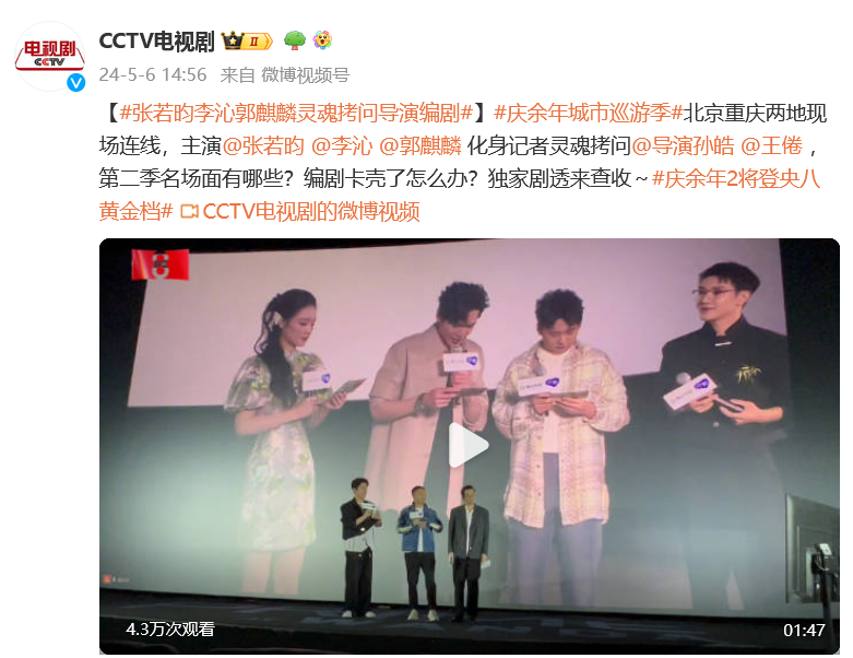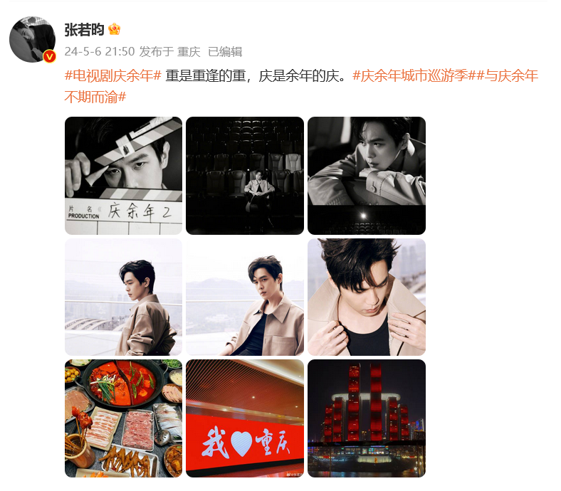 6日晚,该剧主演张若昀晒出参加重庆站巡映的照片回应:“重是重逢的重,庆是余年的庆。”