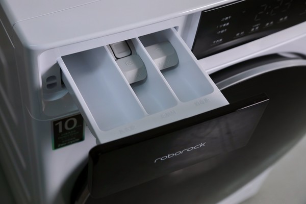 舱门下方是洗衣液储液盒区,做了隐藏式设计,保持了整机的一体化风格。而且它还,同样支持智能投放,用户只需定期将储液盒注满即可,无需每次主动判断应该倒多少量的洗衣液。