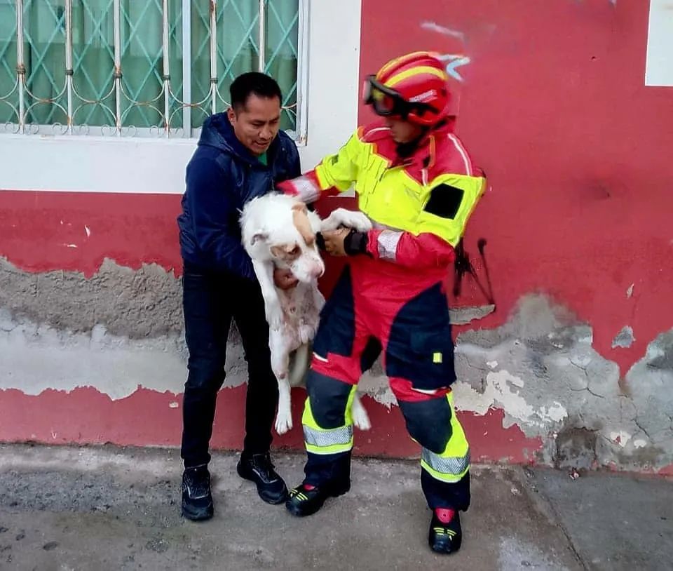 基多消防队很快就驾驶消防车并停在狗狗所在位置下方,没过多久就把这只勇敢的毛孩子救了下来,让它和自己的铲屎官团聚。