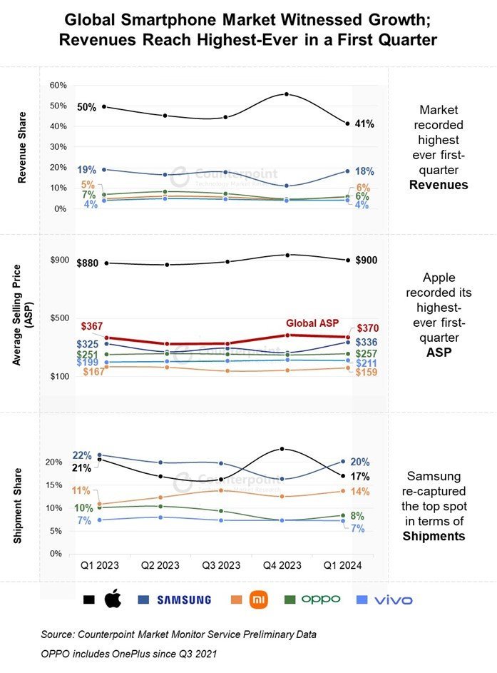 而在全球排名上,根据 Counterpoint 的数据,在其他厂商拥有强劲出货量的情况下,OPPO 也能稳居第四名。