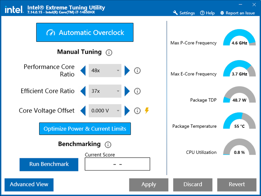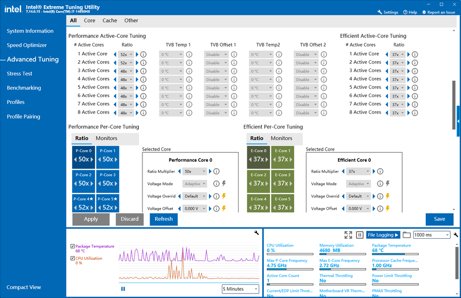 除了一键超频,玩家也可以自行尝试手动超频。启动英特尔XTU这款软件,在高级模式下,点击进入“Advanced Tuning”界面,便可以对处理器进行手动超频操作。