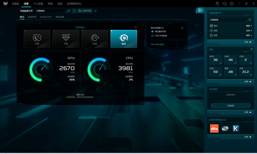 其中,极速模式是这款游戏本的至高性能模式,在该模式下,会自动对独立显卡进行超频。