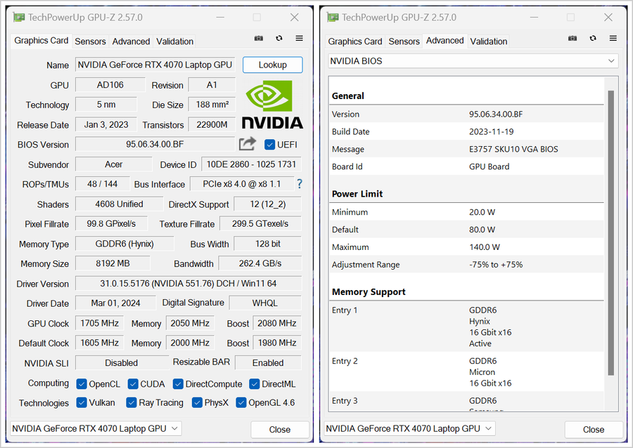 极速模式下,掠夺者·擎 Neo 2024这款RTX4070笔记本电脑GPU的GPU频率会超频至1705MHz、Boost频率会超频至2080MHz,显存频率为2050MHz(等效16400MHz)。