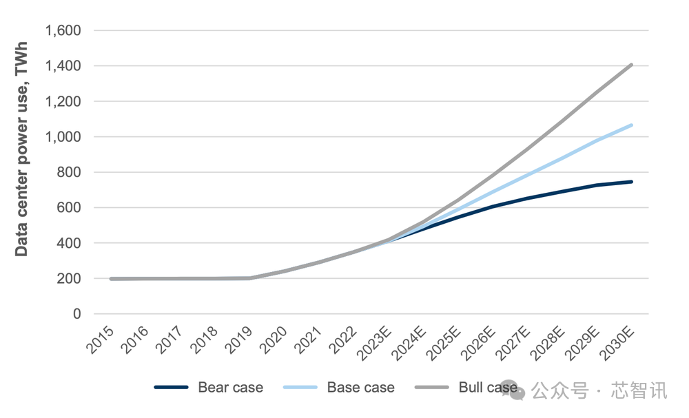 下图展示了未来七年(2023-2030年)数据中心用电的三种情况。在乐观的情况下,电力消耗不会受到限制,前提是相关电力公司的技术支出是充足的。