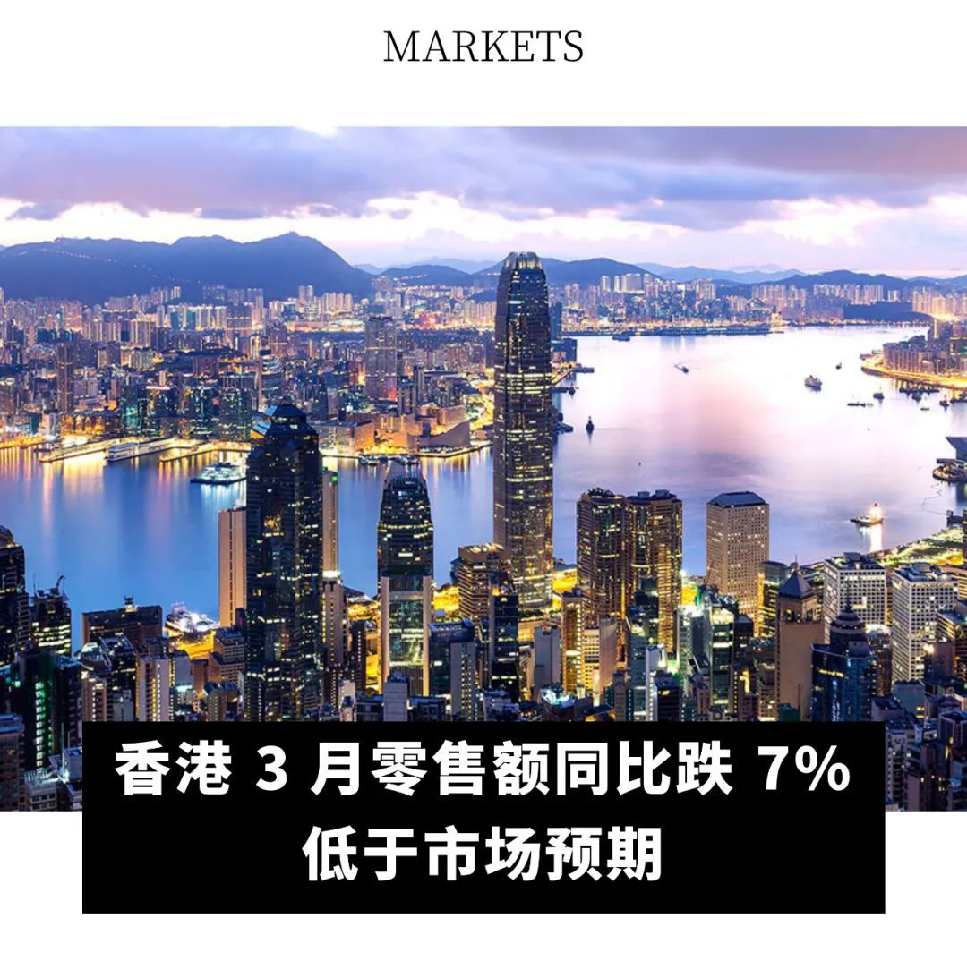 5 月初,香港政府统计处公布,3 月零售业总销货价值临时估计为 312 亿港元,同比跌 7%,逊于市场预期的升 0.9%。扣除价格变动后,零售业总销货数量估计同比下跌 8.6%,亦低于市场预期跌 3.6%。在零售额中,3 月份,同比比较,珠宝首饰、钟表及名贵礼物的销货价值下跌值最大,达17.7%;服装销货价值下跌数额紧随其后,达 17.5% 的跌幅。今年第一个季度,零售业总销货价值的临时估计下跌 1.3%,总销货数量下跌 3.1%,网上销售价值下跌 10.7%。(will)