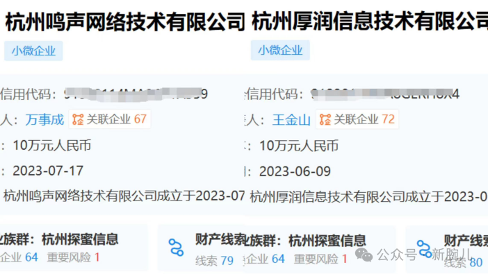 值得留意的是,第一名的公司杭州鸣声网络技术有限公司与先前拆解的剧《八零喜事之肥妻大翻身》的投流公司杭州厚润信息技术有限公司,同时隶属于主体杭州探蜜信息技术有限公司。
