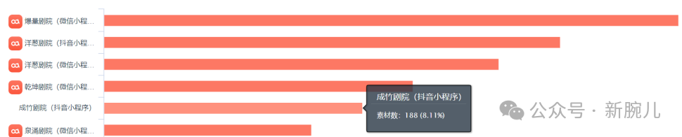 平台方面,这部剧投放第一的平台是爆量剧场(微信小程序),占比18.4%;第二的平台是洋葱剧场(抖音小程序),占比14.33%;第三名是洋葱剧场的微信小程序平台,占比12.39%;排名第四的是乾坤剧场(微信小程序),占比9.71%;第五的是成竹剧场(抖音小程序),占比8.11%。
