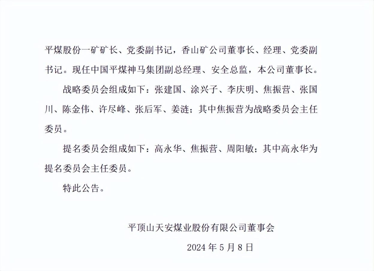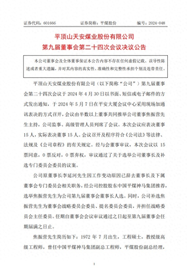 据上海证券交易所网站消息,5月8日,平煤股份公告称,公司第九届董事会第二十四次会议于5月7日在平安大厦会议中心采用现场加通讯表决方式举行。会议由半数以上董事共同推举公司董事焦振营主持,公司监事、高级管理人员列席了会议。本次会议应表决董事15人,实际表决董事15人。经与会董事审议,本次会议以15票同意,0票反对,0票弃权,审议通过了关于选举公司董事长及补选专门委员会委员的议案。