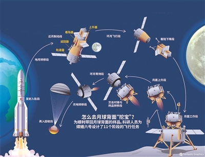 在鹊桥二号中继星的支持下,嫦娥六号探测器将调整环月轨道高度和倾角,择机实施轨道器返回器组合体与着陆器上升器组合体分离。之后,着陆器上升器组合体实施月球背面南极-艾特肯盆地软着陆,按计划开展月球背面采样返回任务。