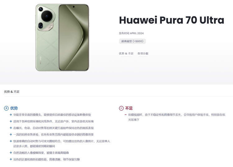 从得分中不难看出,Pura 70 Ultra在拍摄方面几乎是一台没有短板的机器,DXOMARK也给出了“在曝光、色彩、自动对焦等拍照关键方面始终保持出色的画质表现”等溢美之词,唯一诟病的是拍摄视频,指它低光时容易丢失细节。